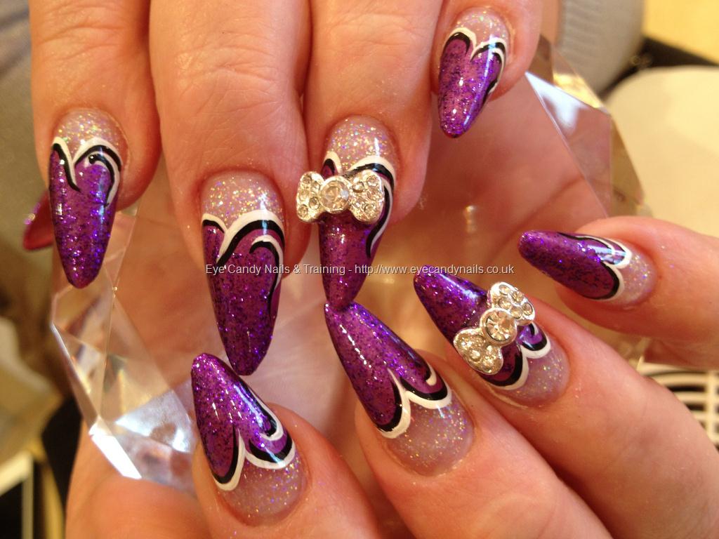 Purple, white and black valentines love heart freehand nail art with crystal bows on acrylic stiletto nails by Elaine Moore on 8 February 2013 at 01:57